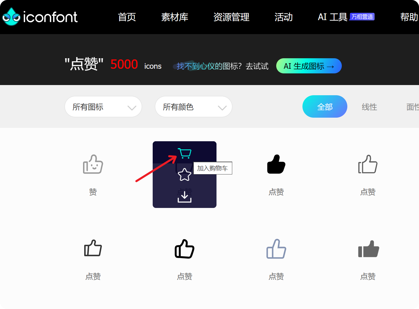 打开阿里 Iconfont 官网,找到你需要的彩色图标,点击加入购物车,然后点击右上角查看购物车内已添加的图标,再添加到自己的项目中(如果没有项目则新建一个即可);