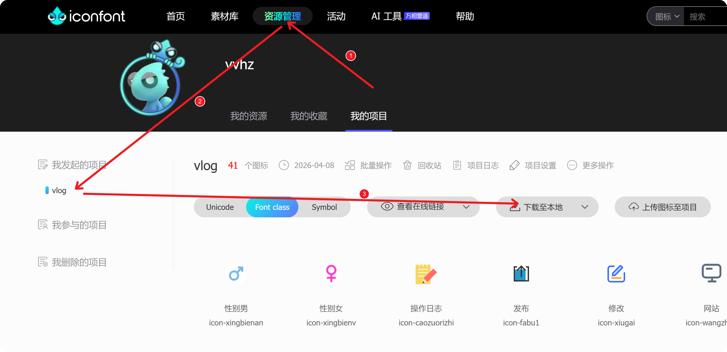 点击资源管理-我的项目,进入图标项目,点击【下载至本地】,会得到一个压缩包;