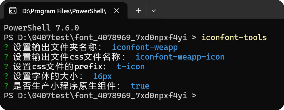 iconfont-tools执行后终端会弹出配置询问(文件名、前缀、路径等),没有特殊需求直接一路按回车默认即可!